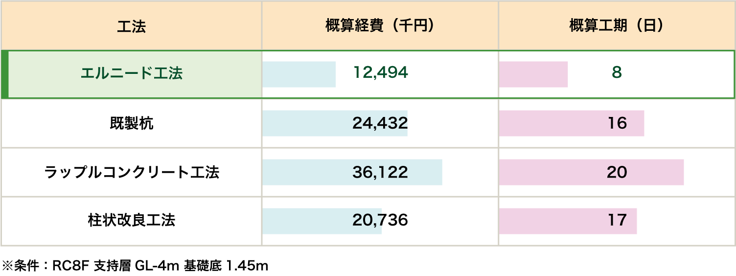 以上のように基礎サイズが未確定の場合、エルニード工法の高支持力で基礎を縮小でき、大幅なコストダウンが成立しやすくなります。ぜひ、基礎の設計段階からの比較としてお気軽にご相談ください。