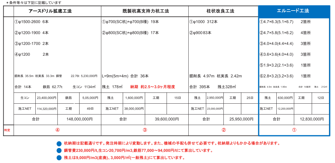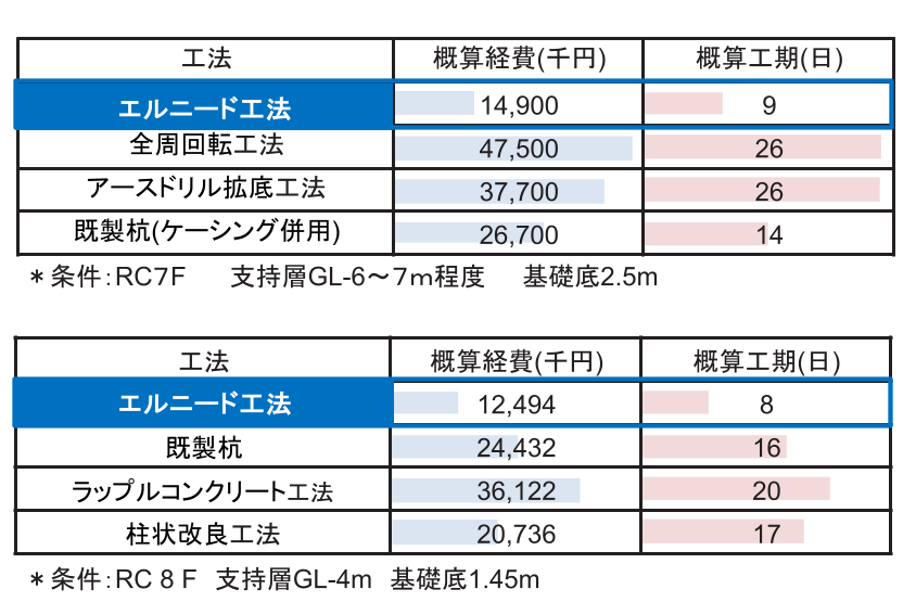 アースドリルや既成杭などの杭工事と当工法を比較した概算表です。
